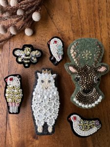ビーズ刺繍の基本の刺し方を1回目に、その後は鳥や虫、動物たちのブローチ作り、布への刺繍もします。